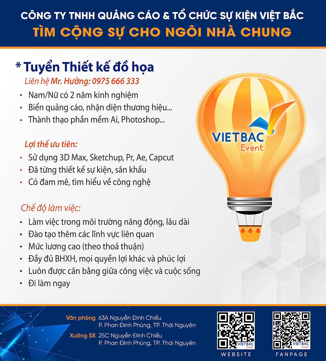 Công ty TNHH Quảng cáo và Tổ chức sự kiện Việt Bắc tuyển dụng nhân viên Thiết kế đồ hoạ.